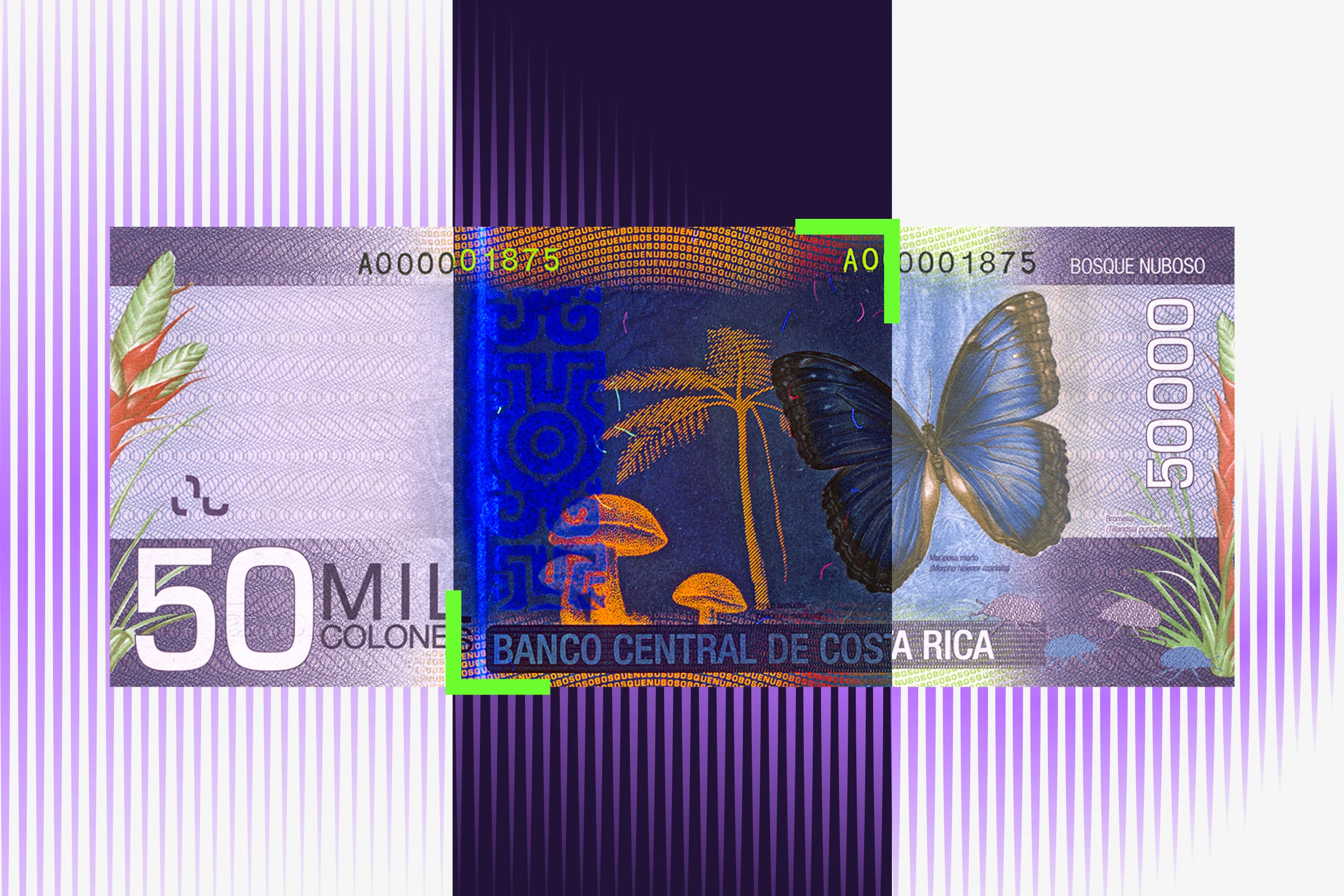 UV glow highlights the bromeliad plant, tree fern, and parasol mushroom, along with the banknote’s serial number and security threads.