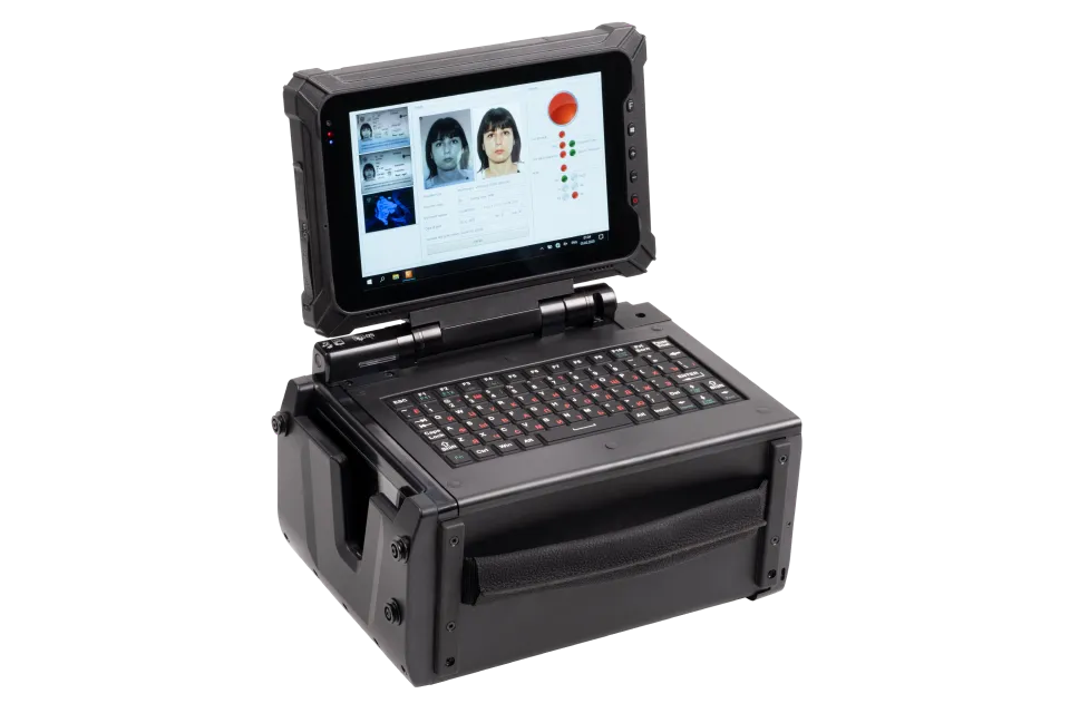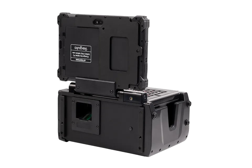 La estación de trabajo consta de una tablet PC y un lector óptico de documentos. La tablet PC tiene una pantalla multitáctil de 8 pulgadas con grado de protección IP67.