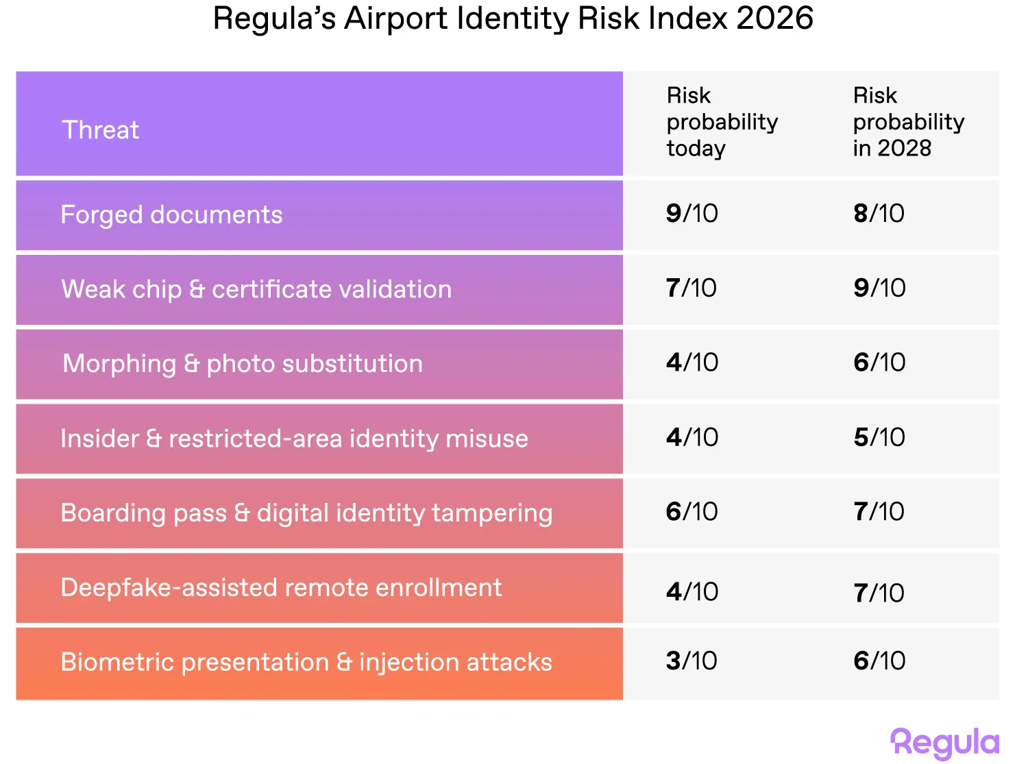 As airports replace physical documents with digital identities, boarding passes with biometrics, and manual checks with automated gates, identity verification (IDV) is becoming the backbone of terminal security — and its most critical vulnerability. To help the industry prepare for the emerging risks, Regula, a global developer of IDV solutions, has released the Airport Identity Risk Index 2026, a practice-driven assessment of the identity threats airports face today and how they are expected to evolve through 2028.