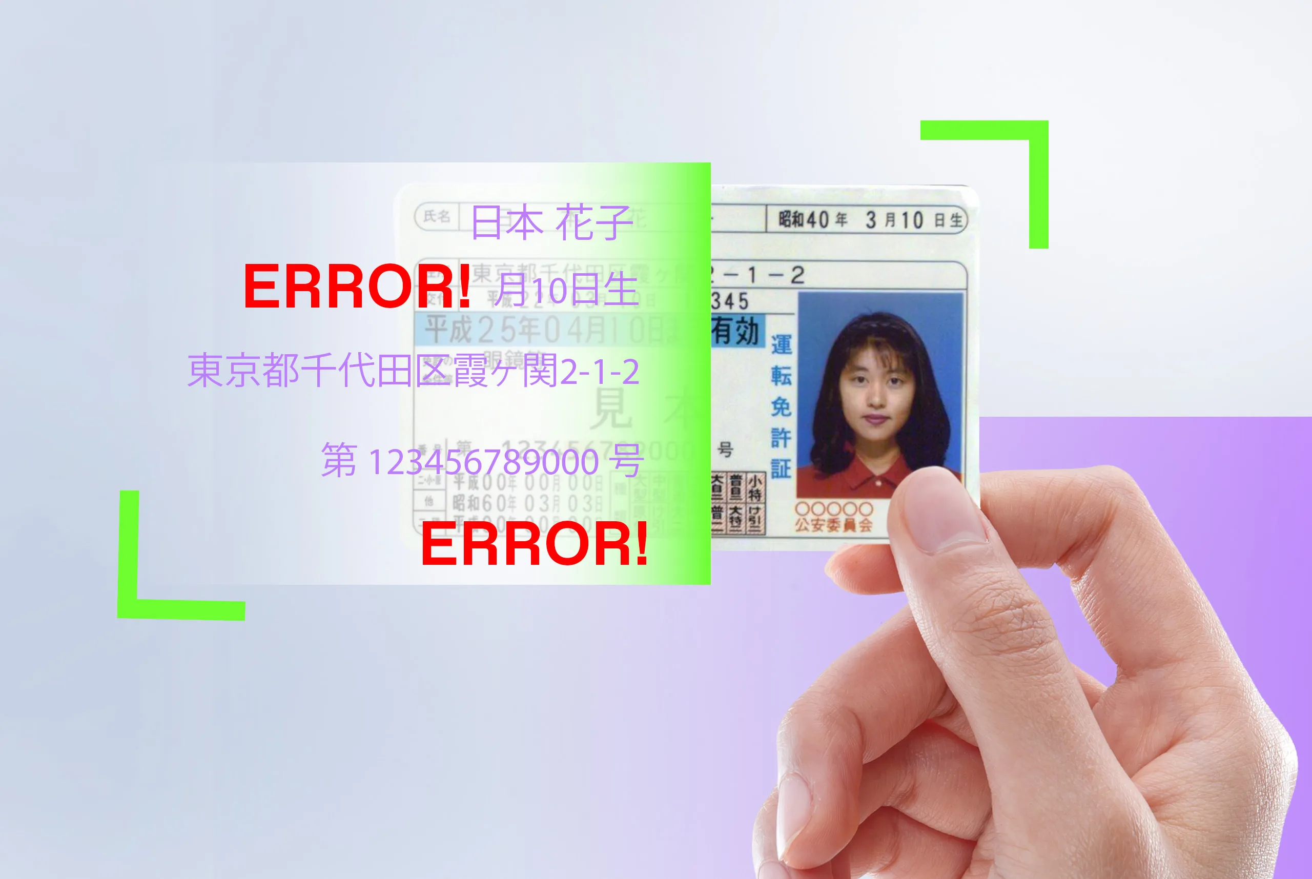 Multiple writing systems in one document. Japanese IDs may combine kanji, hiragana, and katakana, and may contain inconsistencies between the visual and machine-readable zones (MRZs).