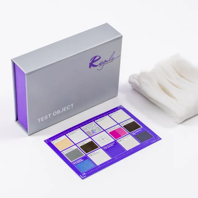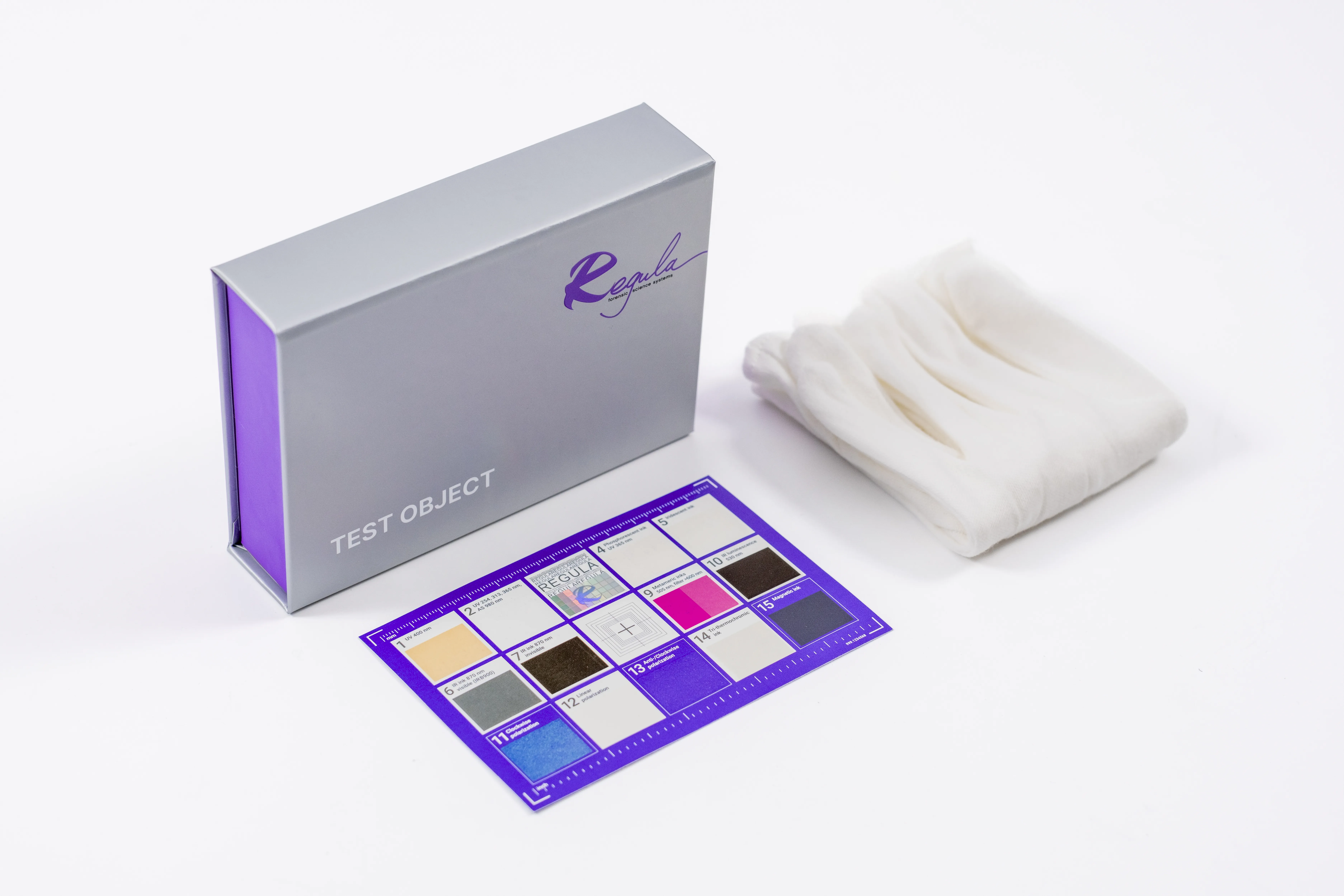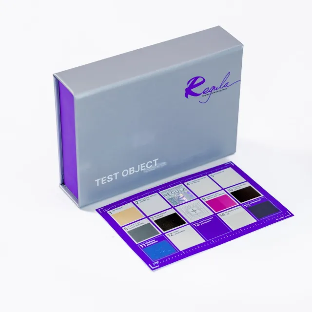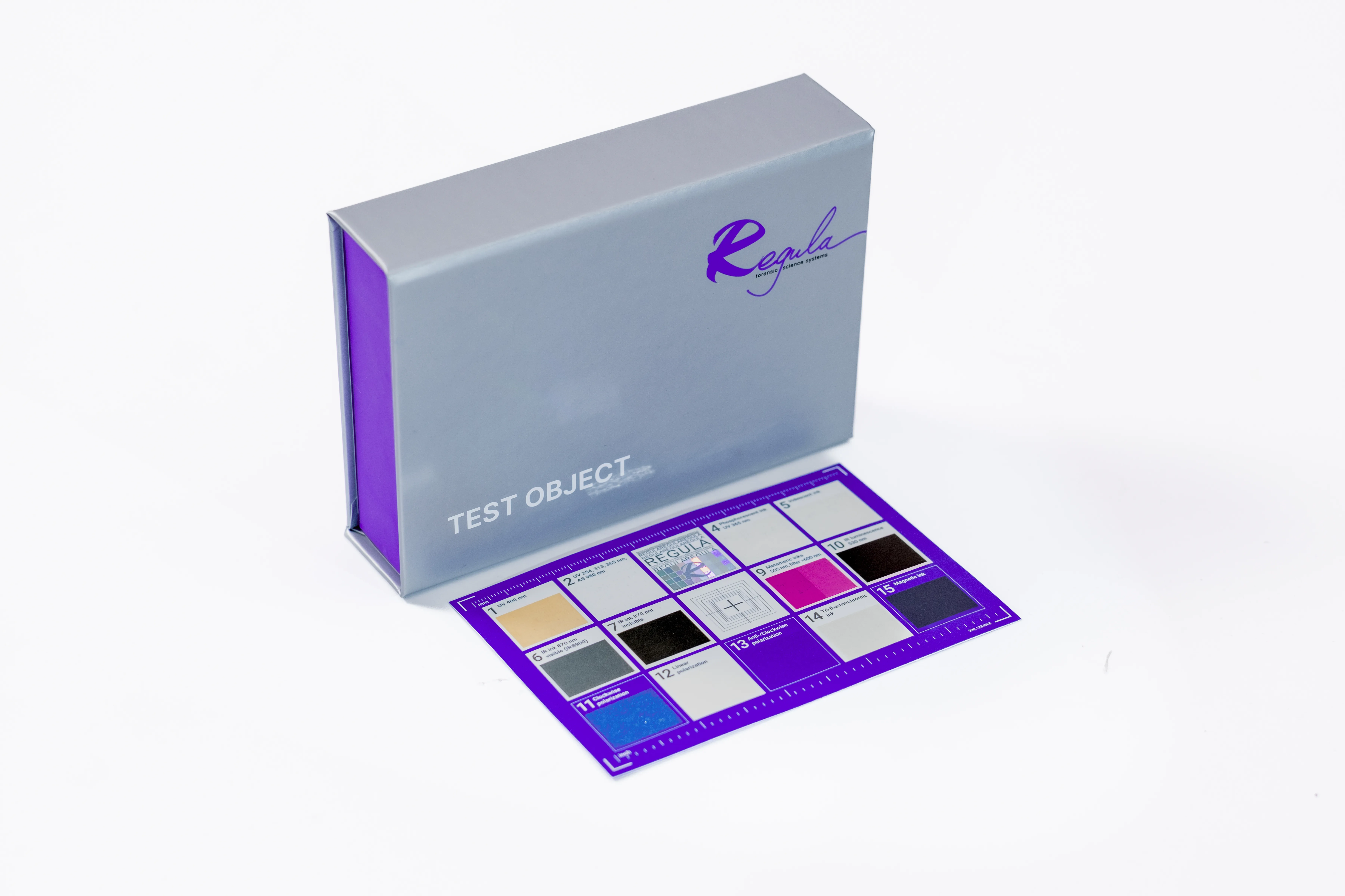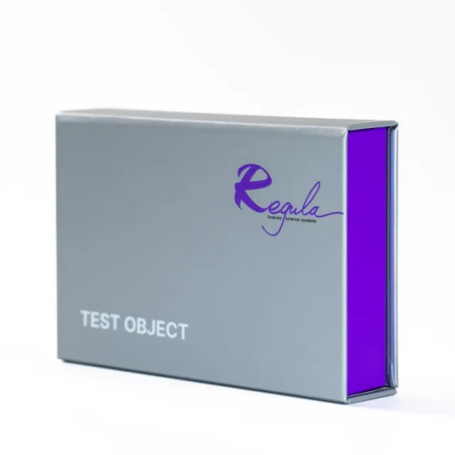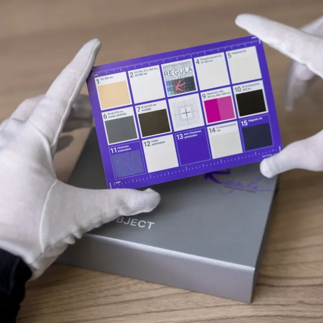 The Test Object Regula 4300 contains a hologram and elements produced with the use of modern inks. Such elements are used as security features in security document and banknote production.